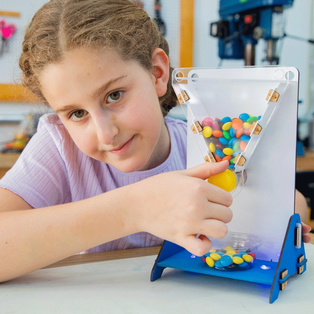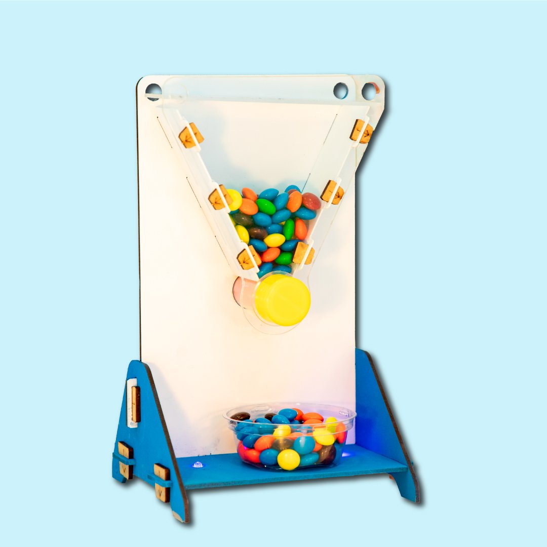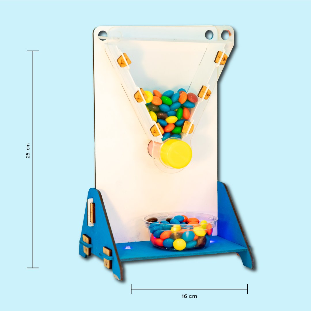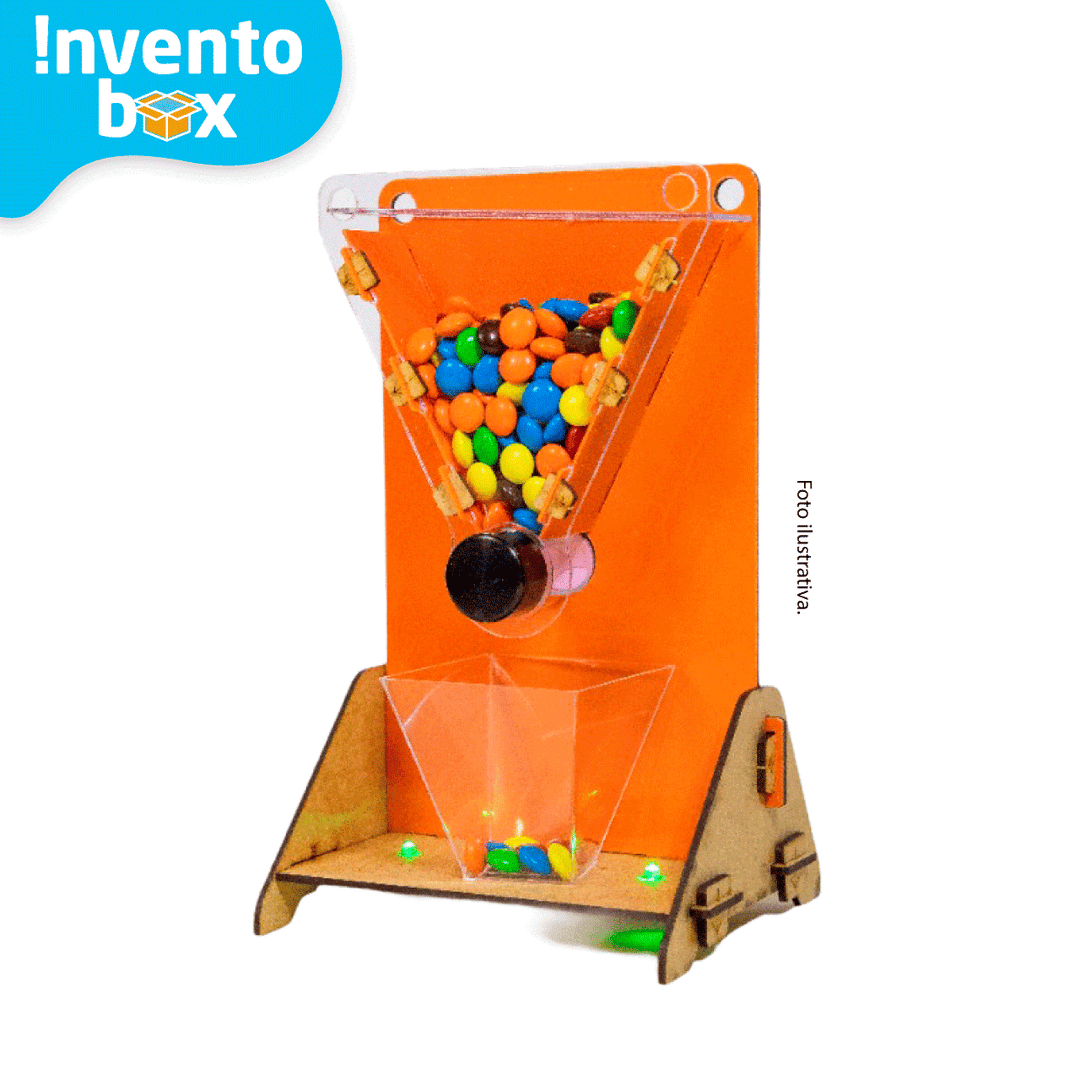 Olha só que legal! Neste projeto você vai construir o seu próprio Baleiro. Abra o saquinho e coloque todas as balas no Baleiro. Cada vez que você girar o dosador, cairá no copo sempre a mesma quantidade.