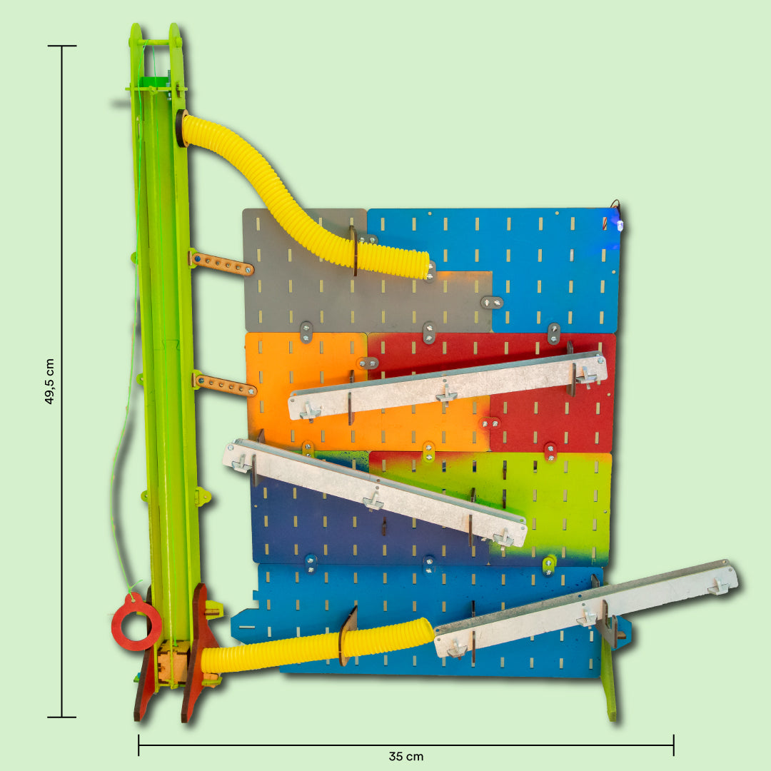 Desafio da escalada 3little: 33,5cm x 18,5cm x 16,5cm | Montanha Russa de gude: 49,5cm x 35cm x 16cm